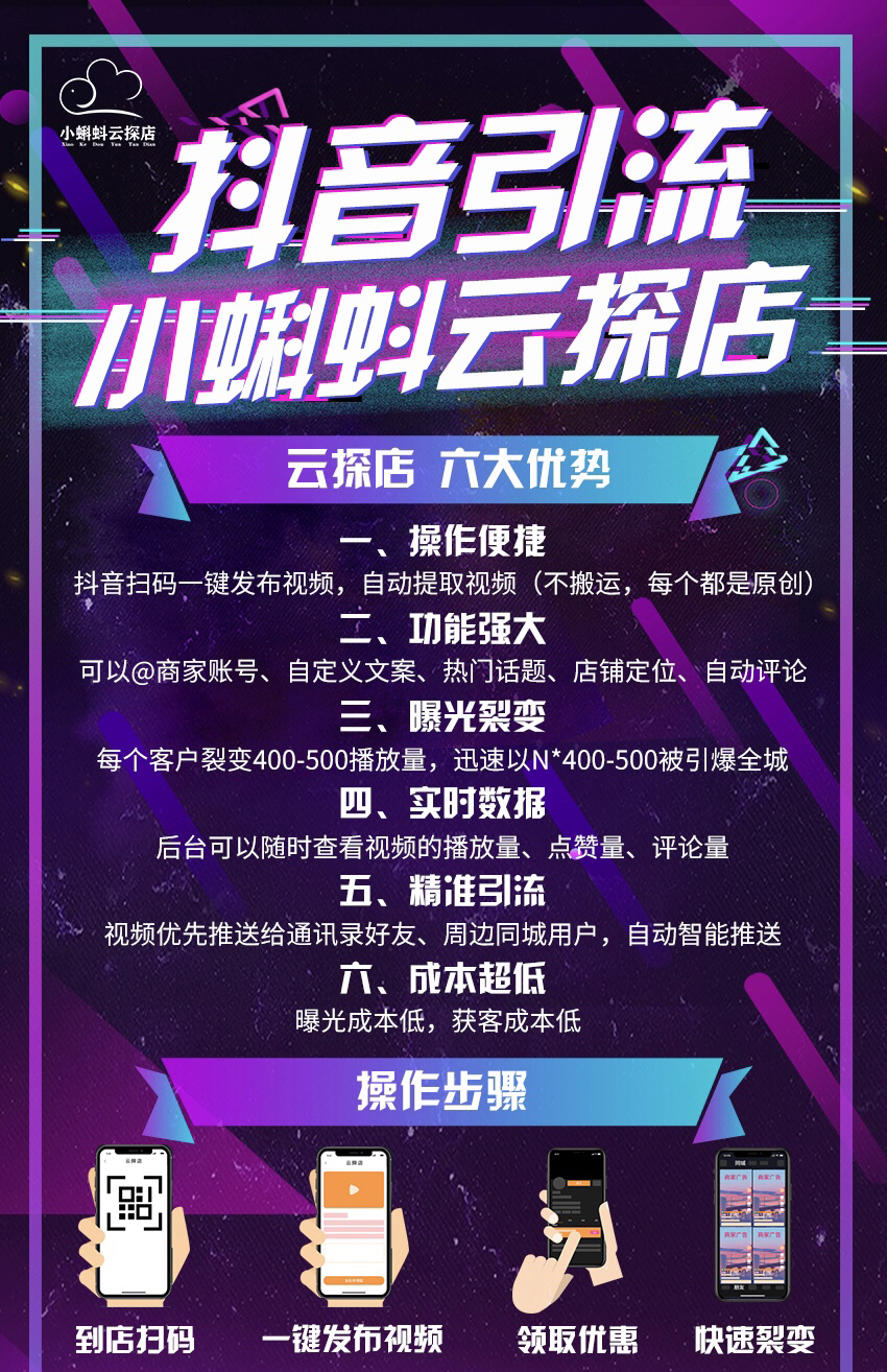 2021年最火爆的风口引流,抖音云探店,帮助商家增加曝光引流,打造网红店,核心功能,一键发布视频,人人都可为商家做免费宣传推广 云探店就是“抖音平台 + 扫码发布 + 探店视频”。 简单来说,云探店就是让消费者到店扫码关注商家,获取授权信息后,一键发布一条带定位的探店视频。这说起来和传统探店差不多,但这条探店视频是由拍摄团队提前将素材处理好,自动生成的专属视频。 线上相比于传统探店,云探店的重点在于“云”。意思是,客户不需要自己制作视频,扫码就可以一键发布。视频不仅带定位、带话题,而且含配音字幕、剪辑、文案等内容,每位消费者发布的视频内容不同,利用多位消费者在自身交际圈做到传播效果。并且抖音区别于传统朋友圈模式,不是好友也能刷到对方视频(推荐、附近、爱好等智能推送,更大流量和更多曝光机会)。