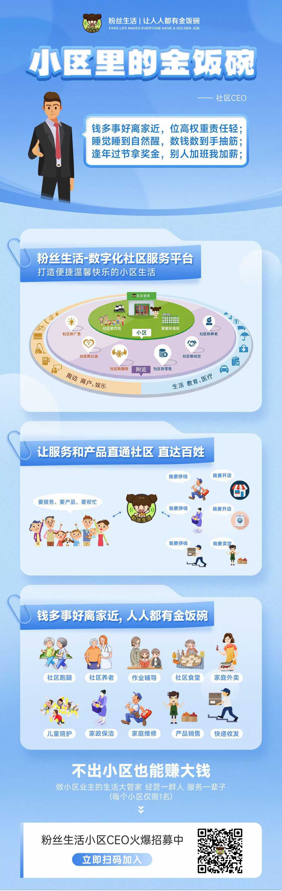 项目名称:粉丝生活平台运营 项目地址:广西柳州市柳北/鱼峰/柳南区 项目介绍:粉丝生活数字化社区综合服务平台,打造便捷温馨快乐的小区生活。让服务和产品直通社区直达百姓。钱多事少离家近,人人都有金饭碗,就在本小区也能赚大钱。你就是小区业主的生活大管家,经营一群人,服务一辈子!目前全国合作小区已达2000+,柳州市场2022年2月入驻之后不到一年的时间已经覆盖11个小区,目前柳南柳北鱼峰区均属于柳州运营中心管辖范围,预计在2023年柳州市三大片区新增合作小区30个以上,新增用户5万人次以上,创业者年收益达到20万以上,O风险合作门槛以及退出机制,为您的创业保驾护航,一次投资终身收益!