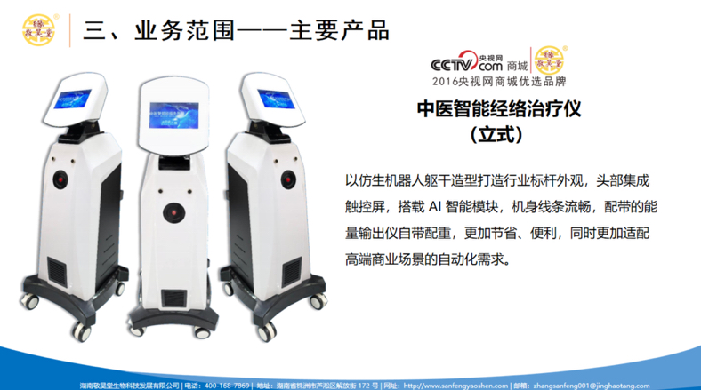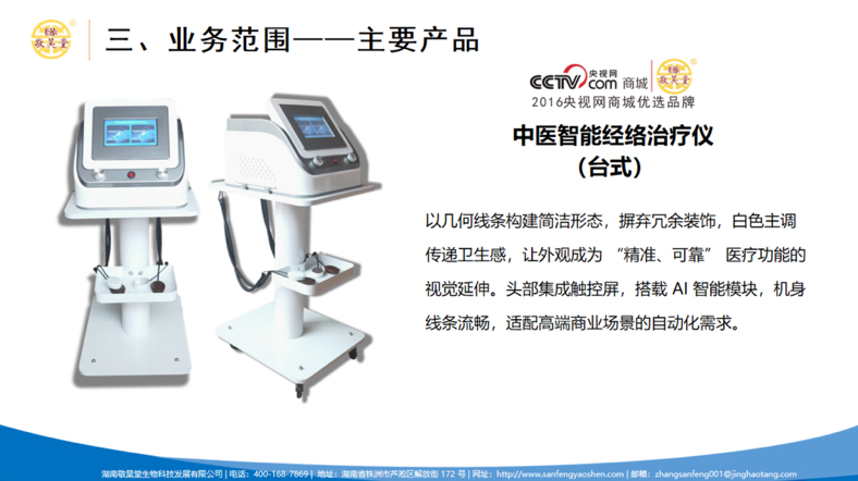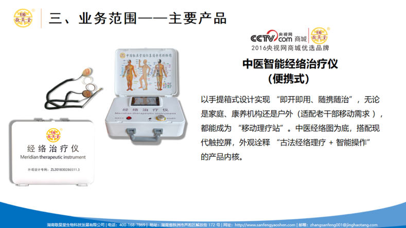 一、为什么选择敬昊堂?——核心优势赋能 1.技术壁垒行业领先:独家痹症灸导疗法+中医智能经络治疗仪双技术驱动,疗效精准获临床验证,如肩颈疗法、腰痛调理等均有标准化流程支撑。 2.资质齐全可靠安全:自研发自生产的中医智能经络治疗仪,属于二类医疗器械,系列相关产品以全部由中国人保承保,安全性及有效性符合国家标准 完整赋能体系,降低创业风险。 培训支持:提供中医技法、营销话术、器械操作、运营管理等全链路培训。 资源倾斜:总部直供品牌物料、客户管理系统、督查团队落地支持,店铺运营系统,确保执行标准化。 激励机制:阶梯式分红政策,优秀合伙人可参与股东分红及长期收益分配。 二、企业文化与品牌背书 1. 核心价值观:“逐一致富、共同富裕”,通过榜样力量带动团队协同发展。 2. 品牌荣誉:入选省级小巨人“专精特新”中小企业名单,具备政府与市场双认证的公信力。 3. 现有门店通过公司提供的模式机制实现客户绑定与复购,客户裂变流程已标准化。 4. 疗法设计基于病因病机辨证、运营模式成熟、确保代理商可快速复制有效方案,落地可行。