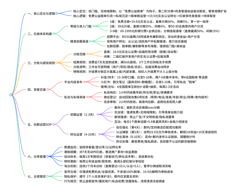 - 高信任度的脱单生态。 平台采用双体系联动模式:全民红娘低门槛参与(1 级仅需 19.9 元实名认证),通过全平台引流获客,享受直推 + 二级红娘的终身二阶分佣;内部经纪人专注后端深度服务,以销售 + 服务双提成驱动精准匹配与高客单转化。 运营核心逻辑清晰:全平台(抖音