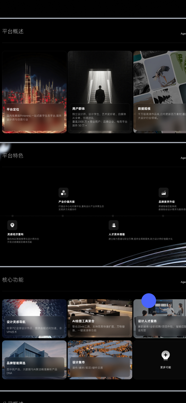 国内第一家集全球设计灵感资源导航、AI创作工具、人才服务与品牌互联,付费教学,于一体的设计师与图片编辑艺术爱好者生态平台,解决3000万各行业设计从业者与自媒体图片编辑人员“找灵感-接项目-招人才-找产品”全链路需求。 借助AI技术,我们根据用户的实际行为数据,实时调整界面的布局和功能。通过用户行为数据分析,Al为设计师提供个性化设计,智能化的推荐,能够为用户带来“千人千面”的独特体验,从而显著提升产品的用户粘性。 WEB3.0、区块链、AIGC等前沿技术,构建了集创意激发、产业互联、人才孵化、品牌升维于一体的新一代数字图片设计生态平台。 5月项目已完成产品验证阶段上线,8月项目已重构1.0版本上线,11月以开始产品2.0版本深化阶段。