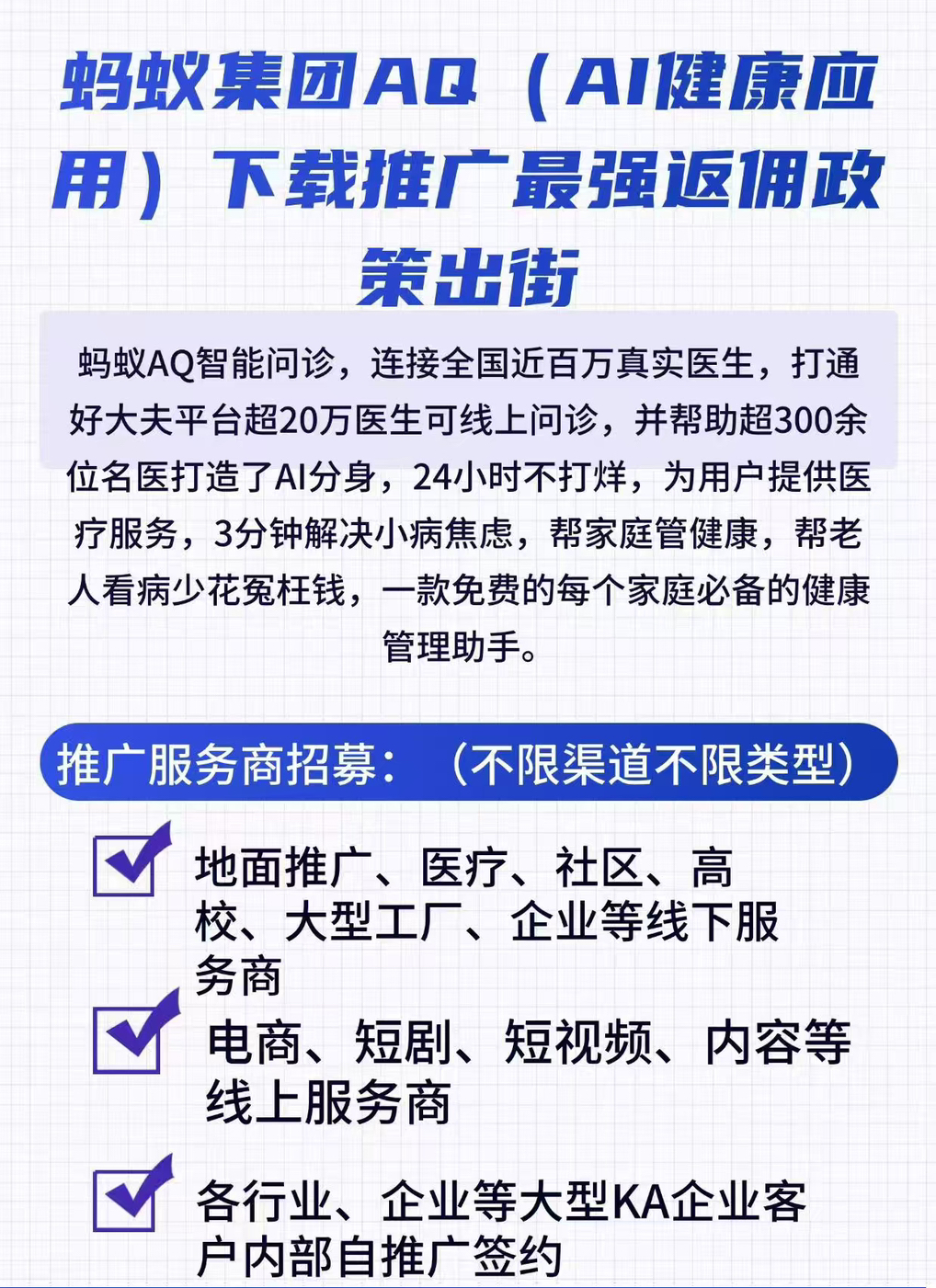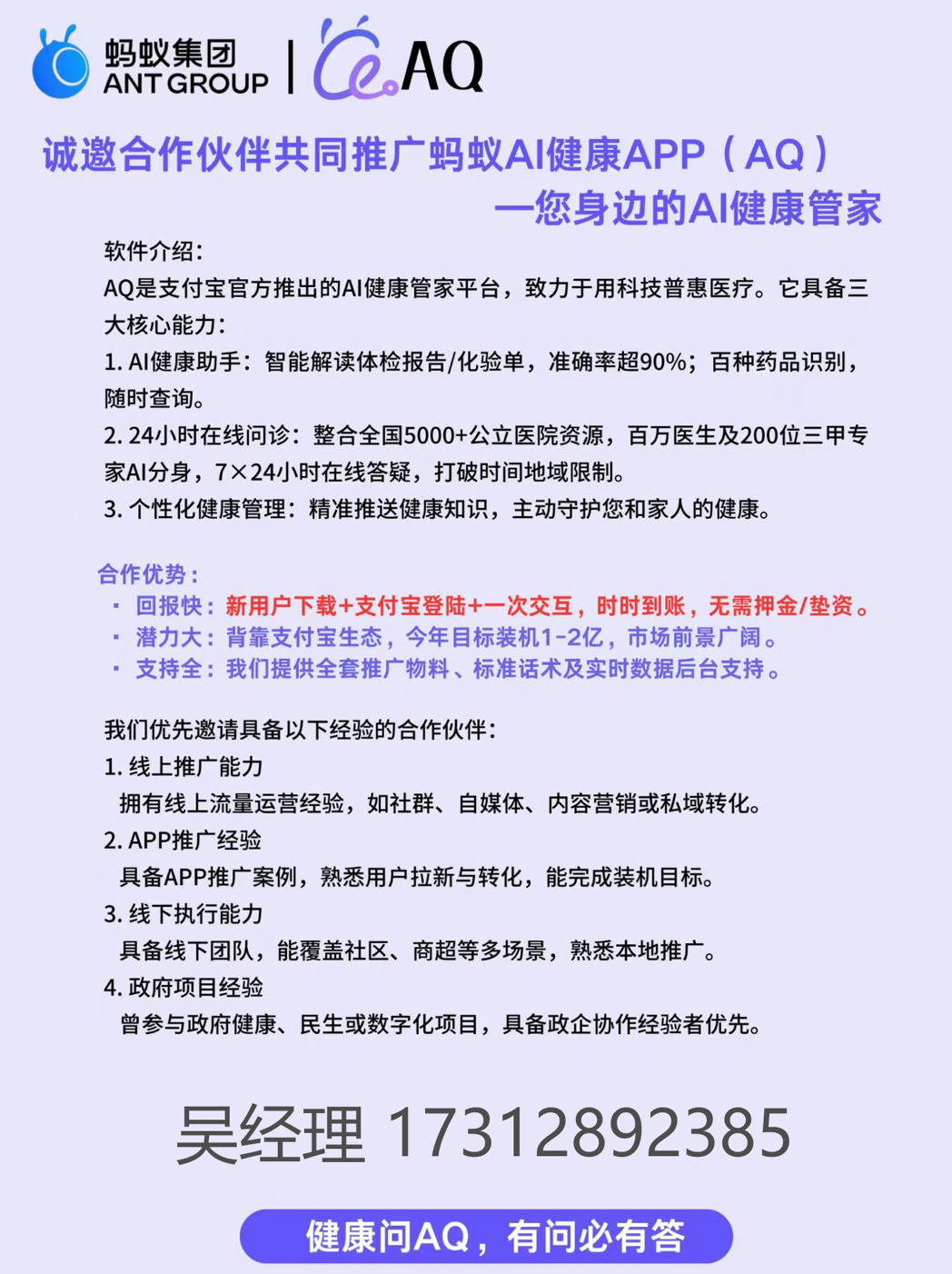 合作类型:拉新 付费方式:后付费 用户群体:大众 推广方式:网推,地推 结算周期:日结 结算方式:CPA 单价:10元 提供资源: 有拉新,下载app,地推,网推等渠道资源的朋友私聊,盘子过亿,无需垫资到账快,全国可展业,日结算 寻求渠道: 无任何限制 【联系方式】微信lzmeimei2020