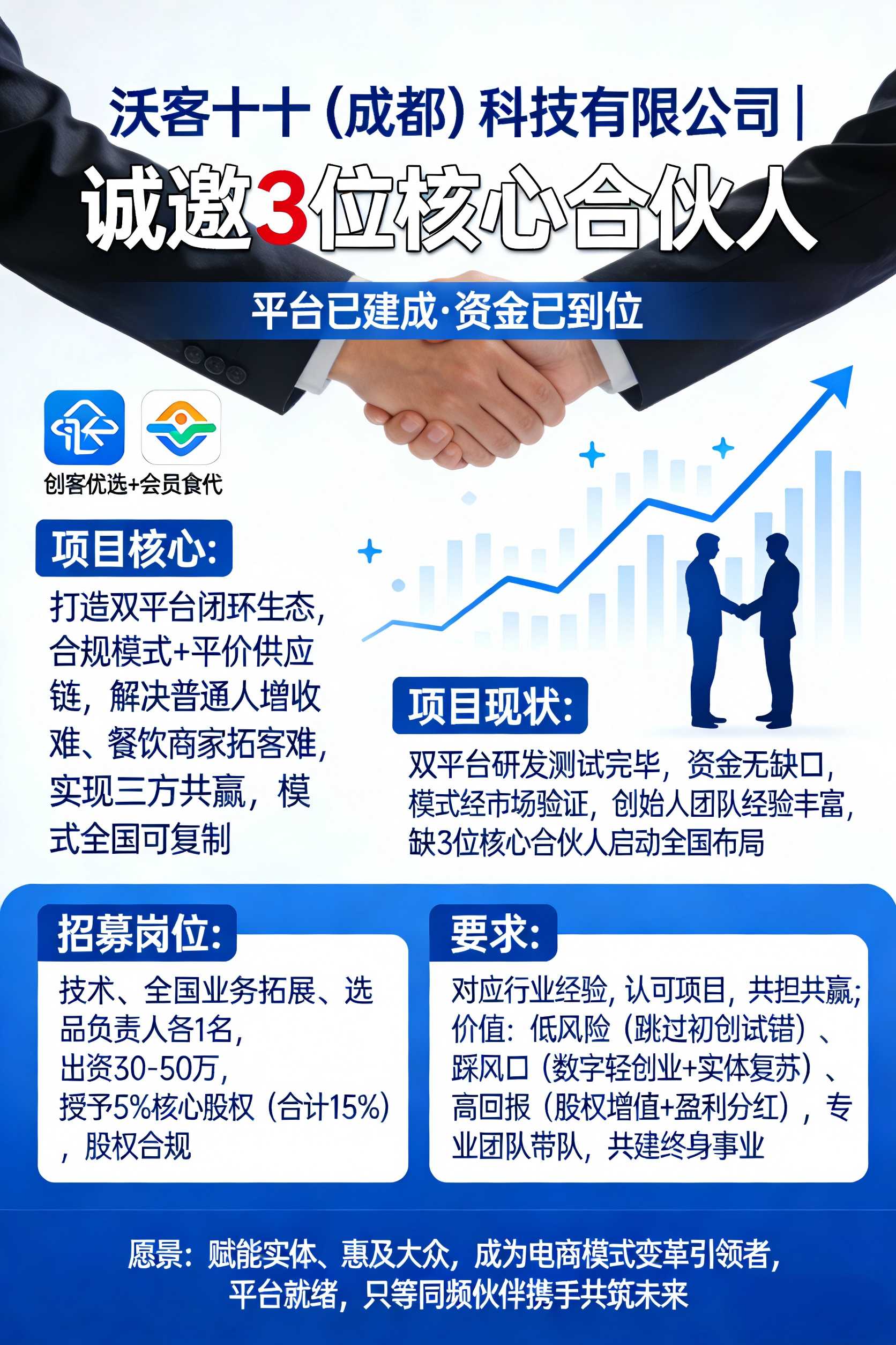 自我介绍:创客优选+会员食代双平台内循环,重构下一代电商生态。 投资经历/偏好:尚无 我在找市场合伙人: 1. 全职专心,全身心入局 必须全职投入、不兼职、不分心,把项目当成自己终身事业,不做旁观者。 2. 懂推广、会裂变、能落地 负责项目全国推广、市场引爆、团队搭建、城市代理拓展, 有强执行力,能把模式快速铺向全国。 3. 有管理能力,能带队伍 能独立搭建市场体系,懂管理、懂激励、懂复制, 一个人能带起一整片战场。 4. 认可赛道,长期主义 深度认同公司愿景与商业模式,目标一致、同频同行, 不搞短期投机,不半途放弃。 5. 缴纳资金投名状 以资金表达决心与信任,同心、同责、同风险、同收益, 我们只找共生死、共成事的真正合伙人。