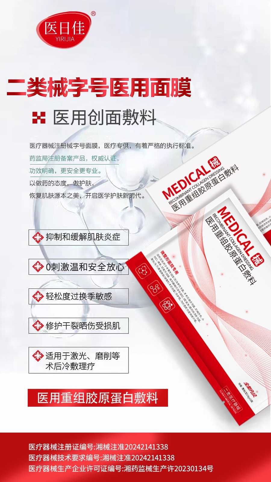 医美面膜厂家面向美容院等医美机构推广,团队,个人均可对接,收益可观,公司免费培训 也欢迎各地经销商前来对接资源 微信:X2997014875 添加好友注明来意 医日佳 | 医用重组胶原蛋白敷料 品牌:医日佳 产品名称: 医用重组胶原蛋白敷料 产品规格:30gx5袋 箱规:100盒/件 21kg/件 适用范围:用于非慢性创面等...可用,激光/光子/果酸换肤/微整形术后创面)的护理,为创面愈合提供微环境下可用。 使用方法:清洁患部皮肤,打开产品的外包装,取出敷料于患者皮肤上,一个星期用2到3次或遵医嘱。 注意事项、警示及提示性说明: 1、儿童及新生儿不可使用; 2、本品为外用品,仅限用于皮肤表面,忌口服; 3、避免入眼,若入眼用清水冲洗即可, 4、使用前请仔细阅读说明书,对产品过敏者禁止使用。 本产品为械字号二类医用无菌面膜