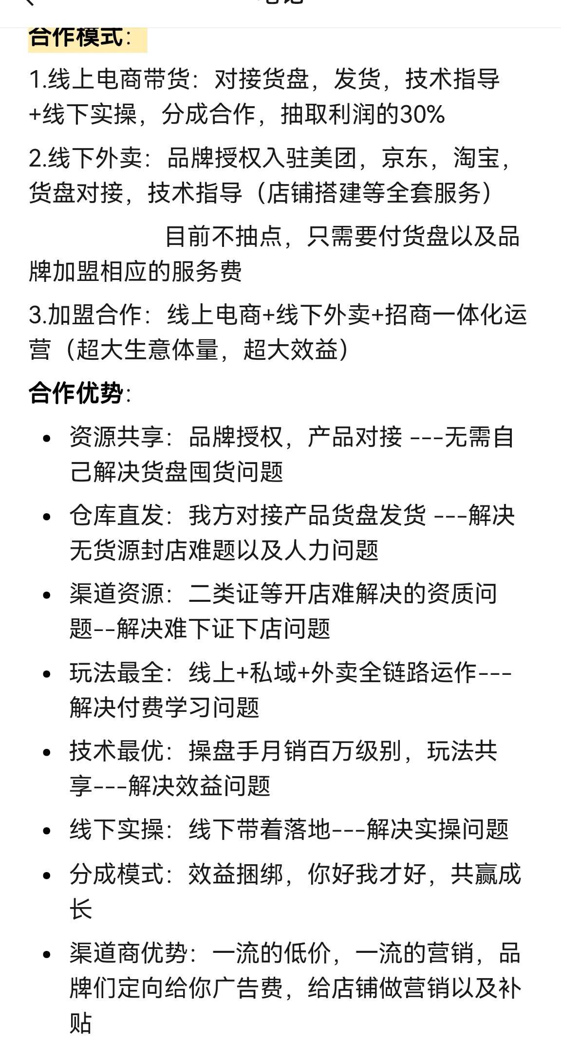 线上电商带货模式:前期不收任何费用,我们给你对接品牌授权和货盘发货,教会你如何运营店铺,店铺产生收益我们收取利润的30% 线下外卖带货模式:做你周边商圈3-5公里的即时零售市场,30分钟之内送达,需要自己进货囤货,给骑手备货,我们不参与抽成