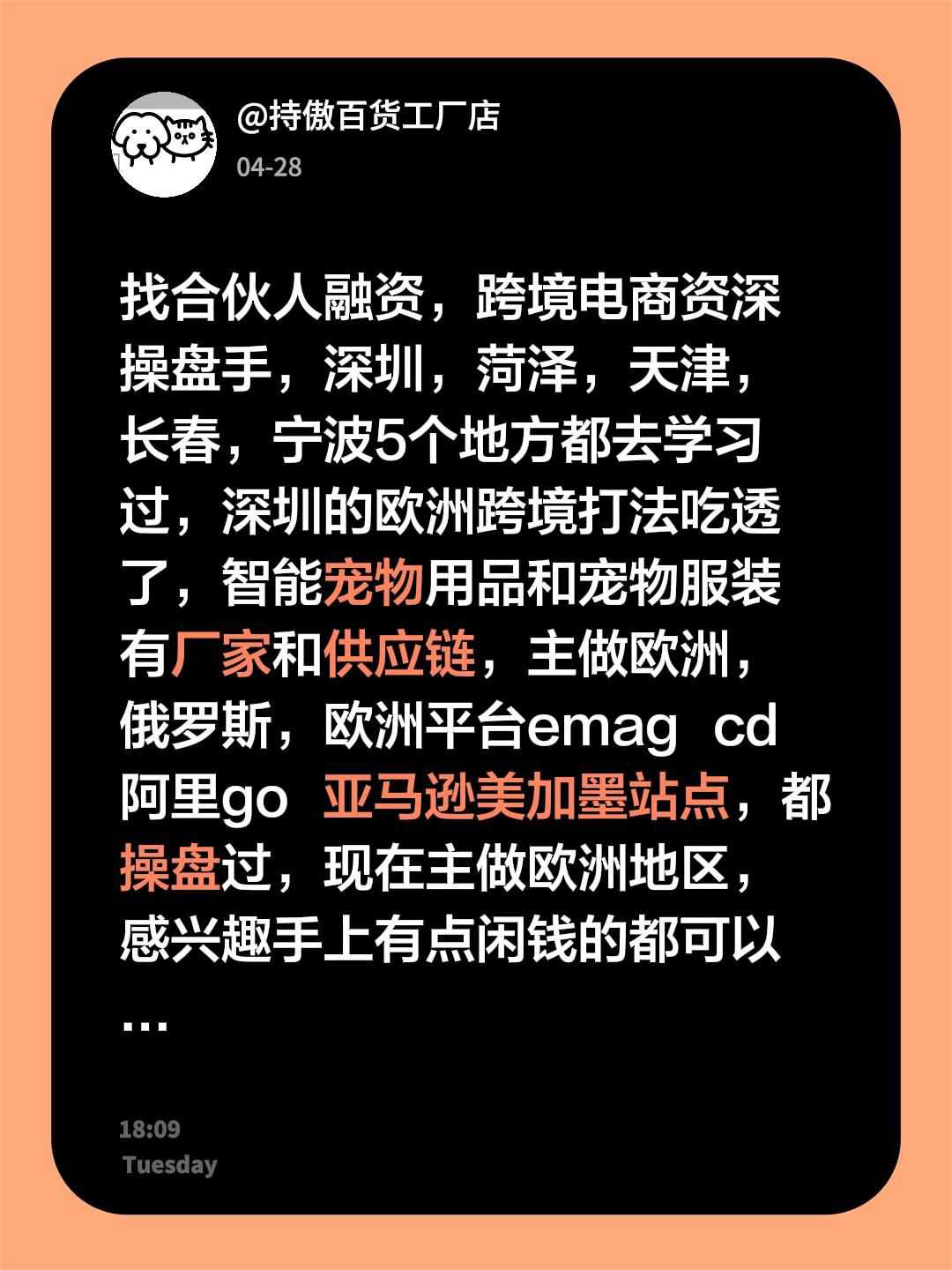 找合伙人融资,跨境电商资深操盘手,深圳,菏泽,天津,长春,宁波5个地方都去学习过,深圳的欧洲跨境打法吃透了,智能宠物用品和宠物服装有厂家和供应链,主做欧洲,俄罗斯,欧洲平台emag cd 阿里go 亚马逊美加墨站点,都操盘过,现在主做欧洲地区,感兴趣手上有点闲钱的都可以来聊,感兴趣的老板或者同行也可以来聊,跨境这块的问题直接发问题,看见就解答,不闲聊不要浪费大家时间,