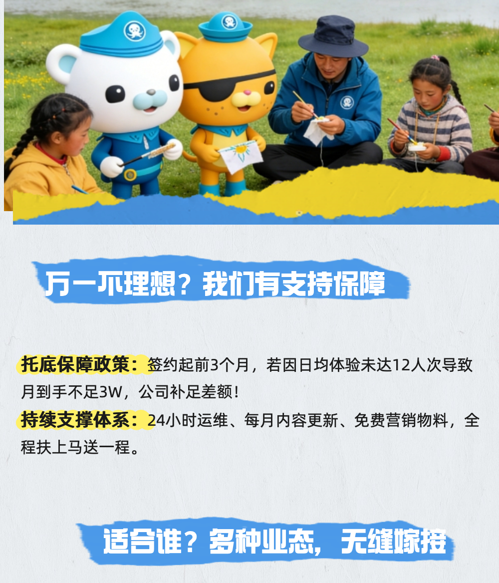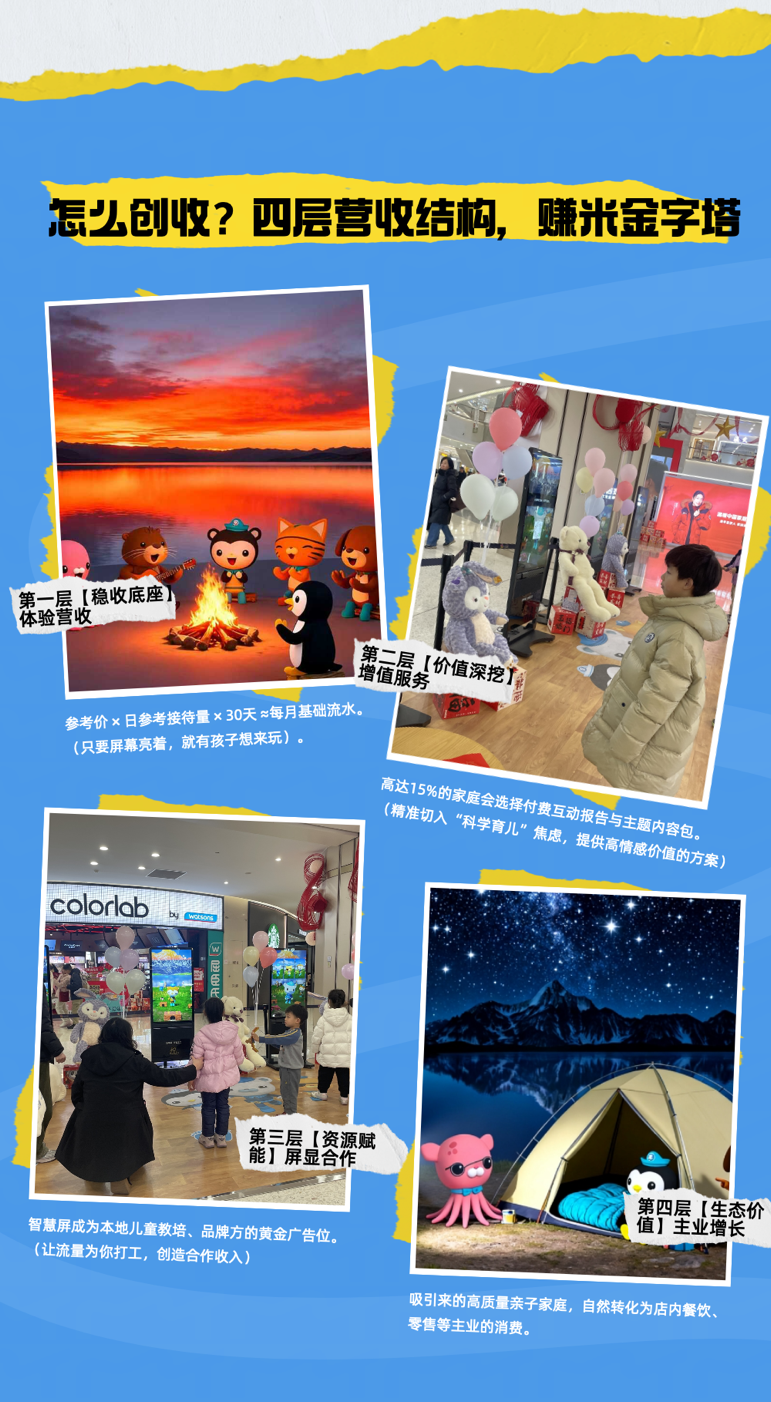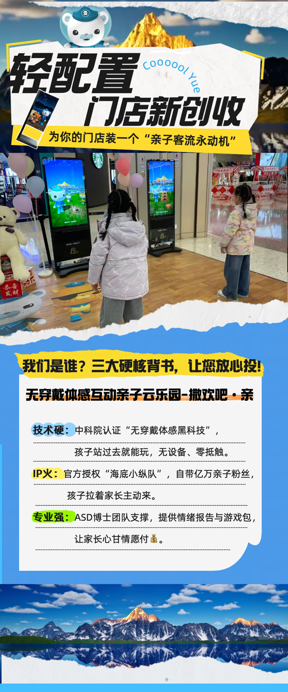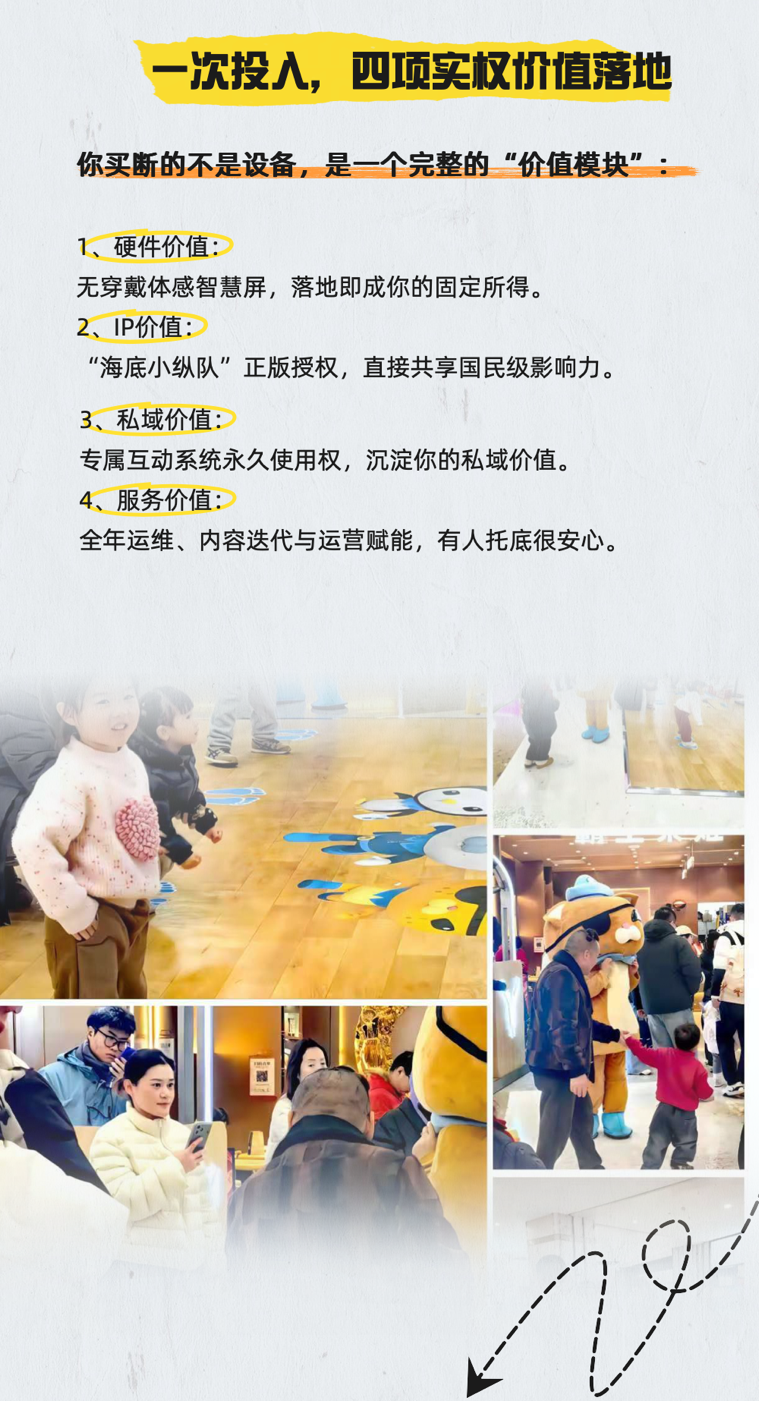 中科院黑科技+海底小纵队IP双赋能,打造无穿戴VR体感游戏!无需设备即可实现毫米级动作捕捉,结合IP“海底小纵队”,提供沉浸式亲子协作游戏体验。内含草原寻宝、角色任务等体感玩法,单局20分钟,支持单次体验(30元)、亲子套票(50元/2次),轻松实现单屏日均12人次稳定客流。另提供ASD情绪适配增值服务,可生成健康报告及个性化游戏包,进一步提升客单价。区域代理可享自营、拓展与流水分佣三重收益。